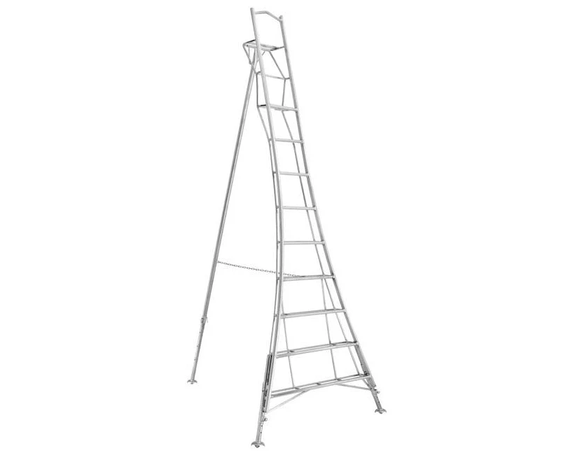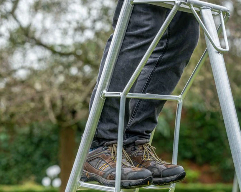 The standing rung is a 7″/18cm platform that makes standing comfortable and secure. The frame design then allows you to tuck your knees into a recessed rung above for extra stability. This supports the upper half of your body which is perfect when you need to reach during tasks like hedge cutting and painting.