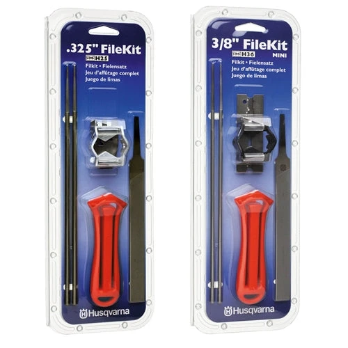 The Husqvarna filing kit comprises two round files, a flat file, a file handle, a file guide and a depth gauge.